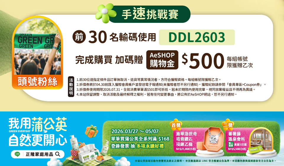 ◍ 03.27-05.07 購買蒲公英全系列商品滿$168登錄發票抽多項永續好禮 ! 登錄發票▸