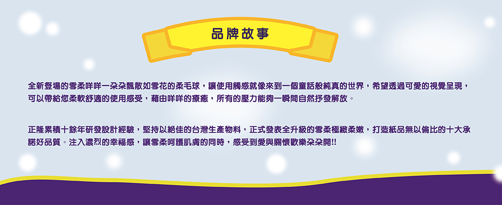 全新豋場的雪柔咩咩一朵朵飄散如雪花的柔毛球,讓使用觸感就像來到一個童話般純真的世界,希望透過可愛的視覺呈現,可以帶給您柔軟舒適的使用感受,藉由咩咩的療癒,所有的壓力能夠一瞬間自然抒發解放。