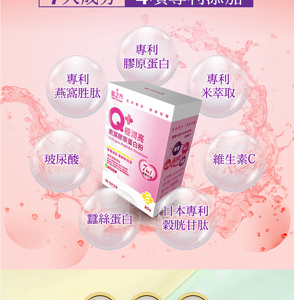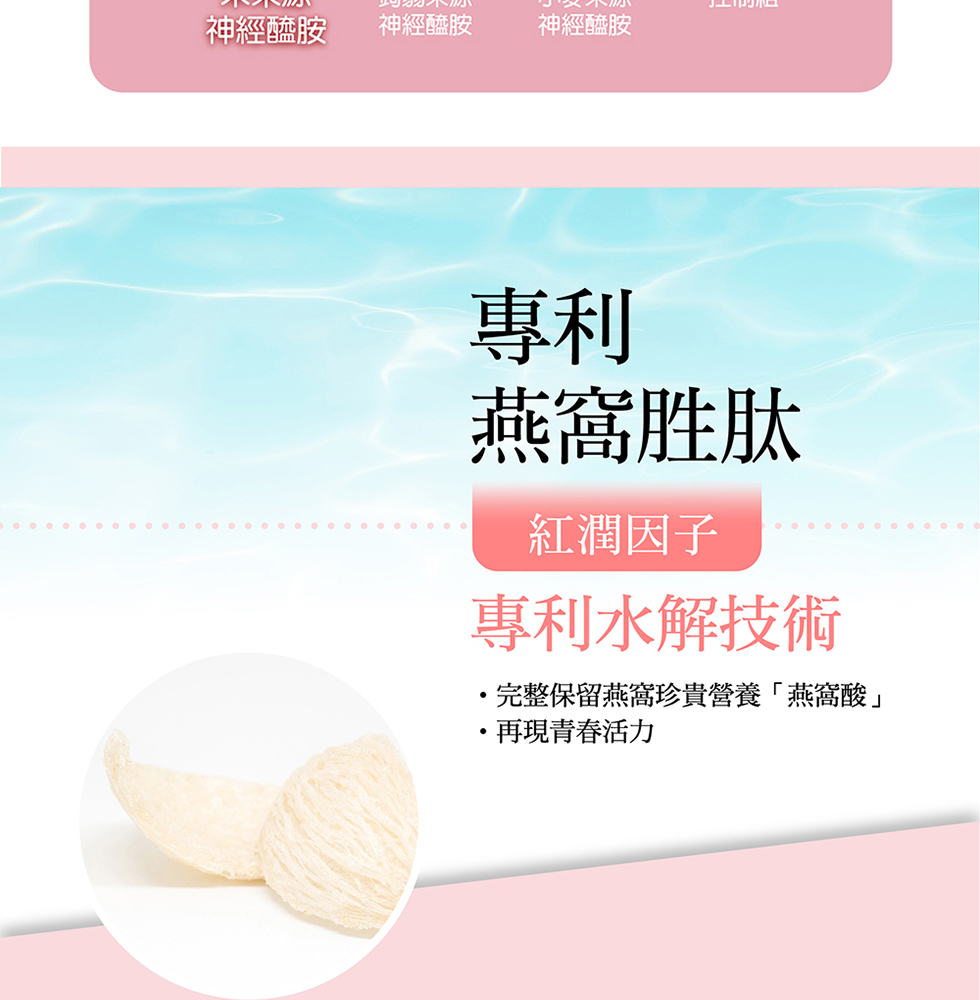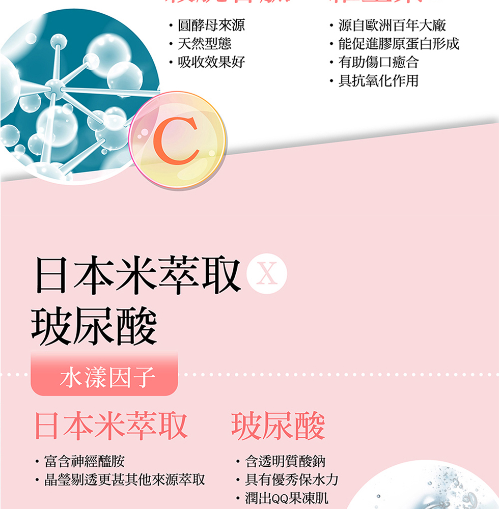 ◆ 蠶絲蛋白+專利穀胱甘肽+維生素◆ 專利米胚芽精華+流行鏈球菌發酵