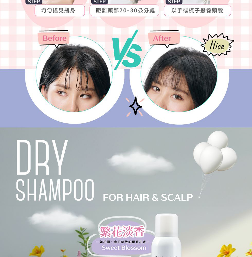 使用方法 : 使用前請均勻搖晃瓶身,距離頭部20-30公分處,噴在較油或有異味之髮根或髮絲處,靜置15-20秒後,再以手或梳子撥鬆頭髮即可。