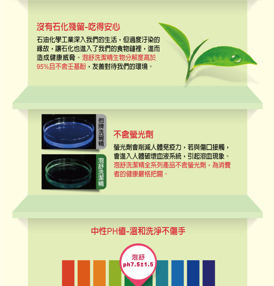 ●榮獲美國USDA綠色產品認證。● 全新升級!添加澱粉酵素去垢配方,快速帶走髒汙油膩。● 中性洗劑溫和不咬手,洗淨力強不殘留、沖洗容易。● 天然椰子油配方,不破壞環境生態。● 添加綠茶萃取液,快速去油除腥,味道不殘留。